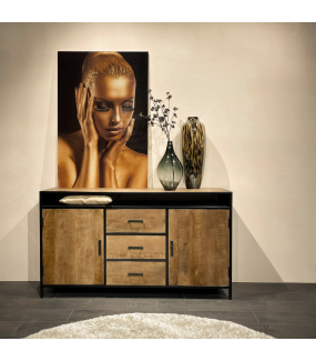 Komoda wykonana jest w stylu industrialnym, występujące na blacie nierówności, sęki i przetarcia nie są wadą a cechą charakterystyczną produktu. Producent celowo zachował owe cechy aby podkreślić przemysłowy i niepowtarzalny wygląd.